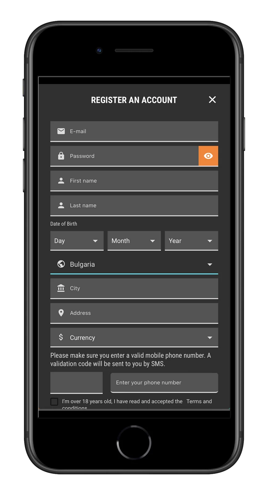 - Fill in the remaining fields: first/last name, date of birth, country, city, address and currency.